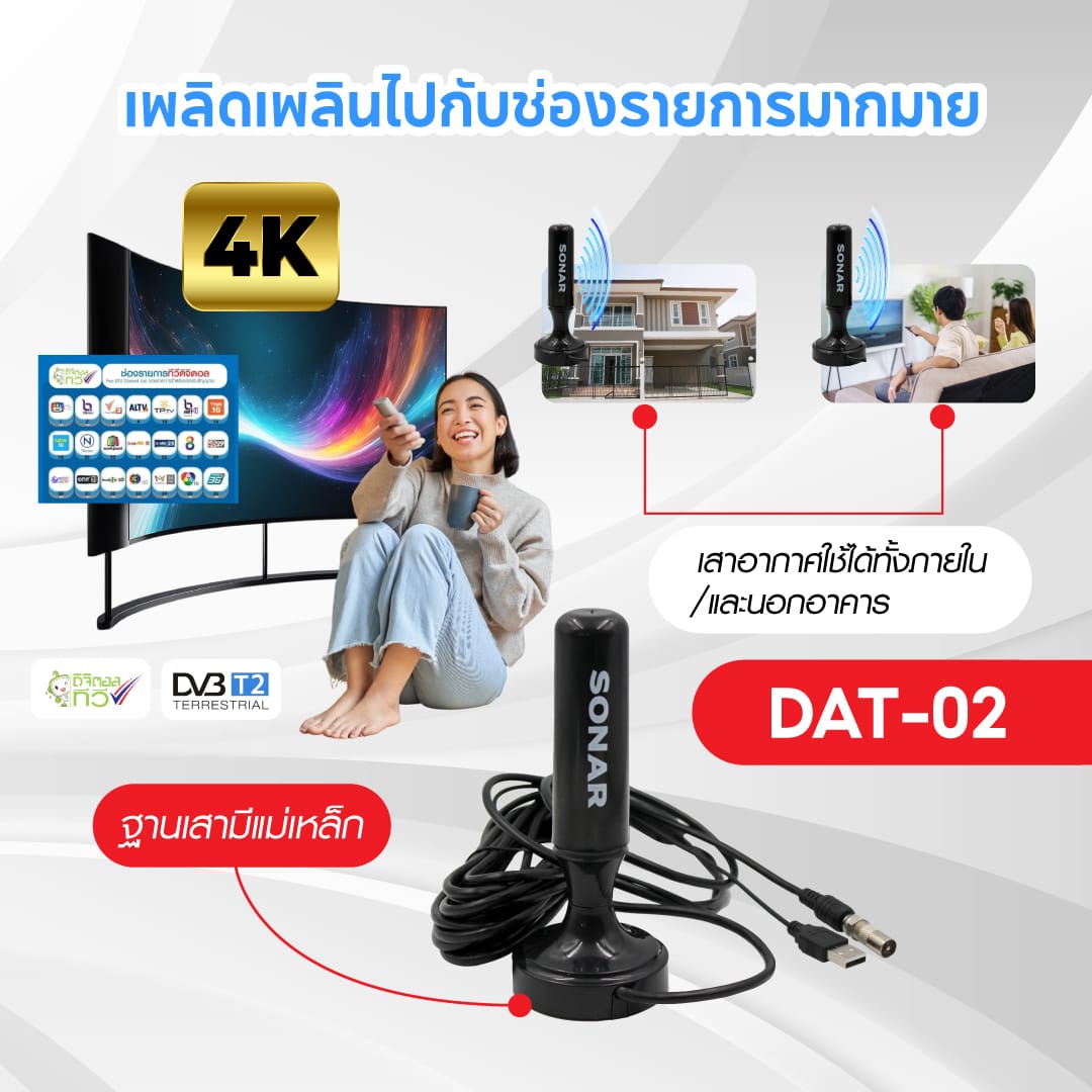 เสารับสัญญาณทีวีดิจิตอล SONAR รุ่น DAT-02 คือเสาอากาศที่ออกแบบมาเพื่อชีวิตยุคใหม่ ใช้งานง่าย ได้ภาพคมชัดระดับ HD ทั้งในร่มและกลางแจ้ง